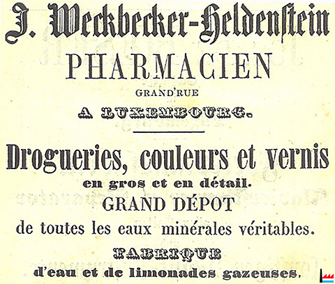 Jean-Pierre-David HELDENSTEIN *29.12.1792 in Echternach als Sohn des Apothekers François HELDENSTEIN und dessen Gattin Marie-Marguerite Seyler. Er wurde laut Memorial am 12.2.1819 in Luxemburg als Apotheker angenommen (Liste des personnes admises à exercer les différentes branches de l’art de guérir dans le Grand-Duché de Luxembourg pour l’année 1830, Luxembourg, imprimerie Lamort). Übernahm von seinem Schwiegervater Jean-Guillaume SEYLER die Pelikanapotheke, „près le Puits rouge“ (Almanach 1829), die er 1852 an seinen Schwiegersohn M.R.J. WECKBECKER-Heldenstein abtrat. Brände in der Apotheke In der Nacht vom 3./4. 10.1820 übertrug sich im Laboratorium Heldenstein Feuer über ein Ofenrohr auf den Fußboden und führten um ein Haar zur Katastrophe. Da aber noch Leute wach waren, gelang es, die Flammen schnell zu löschen. Dieser Zwischenfall gab dem Polizeikommissar J.P. Müllendorff die Gelegenheit, dem Bürgermeister und den Schöffen vorzuschlagen, noch vor dem Winter, einer Jahreszeit in der Brände am häufigsten waren, eine neue Schornsteinbesichtigung durchführen zu lassen (zit. M. Trossen, Brände, Pompiers und Feuerspritzen, Das Feuerlöschwesen im Luxemburger Land, 2009 S.690). Im Dezember 1821 wurde das Feuerlöschwesen der Stadt Luxemburg gar komplett überholt ... Am 17.7.1849 sprang eine Vitriolflasche im Keller der Apothekeund entzündete sich. Der hervordringende Qualm verriet die Gefahr. Wären die übrigen Flaschen gesprungen, so wäre eine schwere Explosion erfolgt. Zum Gück gelang es noch rechtzeitig, alle Öffnungen zum Keller zu verstopfen, wodurch das Feuer erstickt wurde" (LW: vom 18.7.1849).