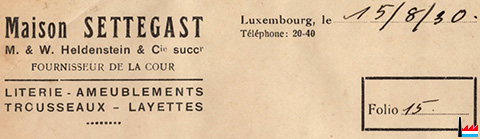 | 5.1946 | 20 40 Settegast (Maison), F. & W. Heldenstein & Cie, blanc, trousseau, literie tapis et linoleum, rue du Fossé, 9. (Indicateur officiel des abonnés aux réseaux téléphoniques - 1ère partie : Ville de Luxembourg - Mai 1946.) |