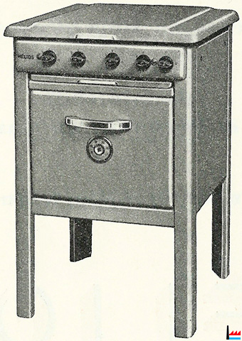 1955 - HÉLIOS - Cuisinière au gaz sur pieds hauts à 1 four, sans étuve - 653 M et 654 M - Dans: "Luxembourg - Au service du Congo" - Publié par le Service d’expansion économique avec la collaboration de la Fédération des industriels, 1955, Imprimerie Bourg-Bourger, Luxembourg (Collection Charles-Louis Aschman)