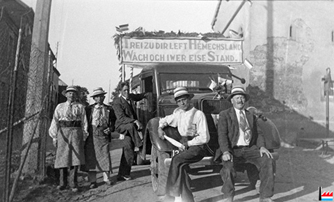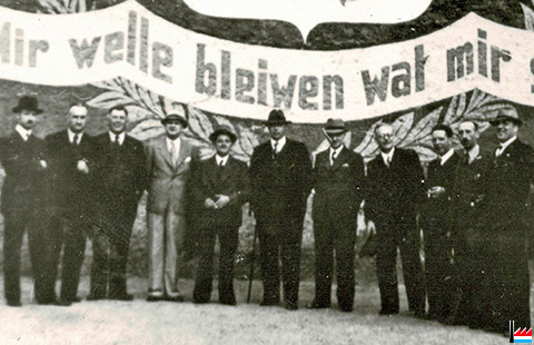 ![]() De Won, den déi Mäerzeger Steenhaer gerëscht hate fir den Ëmzuch fir d’Onofhängegkeetsfeier am Joer 1939 zu Mäerzeg (Collection: Claude Staudt) TREI ZU DIR LEIFT HEMECHTSLAND WACH OCH IWER EISE STAND |