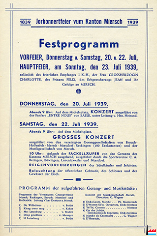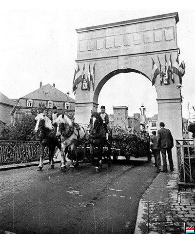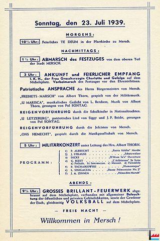 | 9.7.1939 | ![]() Loss viru blenken d'Freihetsonn, Kantonalfest in Remich - 9.7.1939 (Cartes postales: Collection: industrie.lu) Umzug zur Unabhängigkeitsfeier des Großherzogtum Luxemburgs 1839 - 1939 auf der Mosel |