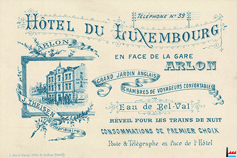Hôtel du Luxembourg, Arlon (Belgique), en face de la Gare, J. Theisen, propriétaire, tél: 39 - Eau de Bel-Val (Carte postale: G. Chenot, graveur, 55 rue du Jardinier, Bruxelles; Collection: industrie.lu)