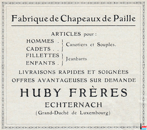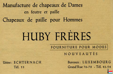 | 1910 | Gebrüder Huby, Echternach Strohhutfabrik Inhaber: Henri Huby, Echternach (Inscription au registre aux firmes N° 74 - Du 6 juin 1910) |