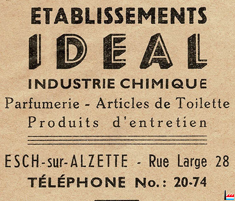 | 1947 | Fabrique Chimique Idéal Crèmes, poudre à lessiver et à récurer Bureaux: 28 rue Large, Esch/Alzette |