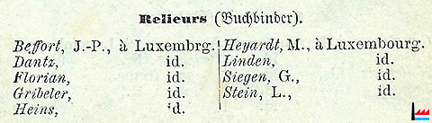 Relieurs - Buchbinder - 1857 (Beffort, J.P., Dantz, Florian, Gribeler, Heins, Heyardt, M., Linden, Siegen, G., Stein L., à Luxembourg) - (Source: Almanach du Commerce du Grand-Duché de Luxembourg par N.C., 1re année, 1857, Luxembourg, Heintzé Frères, Libraires-Éditeurs; page 39 - Collection: famille Aschman-Bodson)