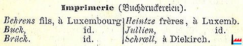 | <=1857 | ![]() Imprimeries - Buchdruckereien - 1857 (Behrens fils, Buck, Brück, Heintze frères, Jullien, à Luxembourg; Schroell, à Diekirch) - (Source: Almanach du Commerce du Grand-Duché de Luxembourg par N.C., 1re année, 1857, Luxembourg, Heintzé Frères, Libraires-Éditeurs; page 30 - Collection: famille Aschman-Bodson) |