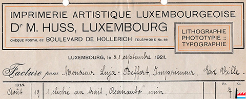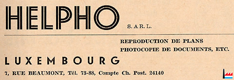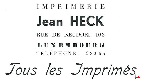 | 1948/49 | Huss Ed & Cie Imprimerie Artistique Luxembourgeoise 68a boulevard de la Pétrusse (anct. bld de Stalingrad) |