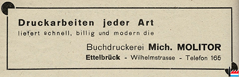 | <=1935 | Imprimerie Muller Henri, Echternach, 12 rue de la Gare, librairie - papeterie, souvenirs - maroquinerie, tél: 165 |