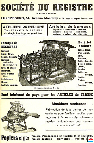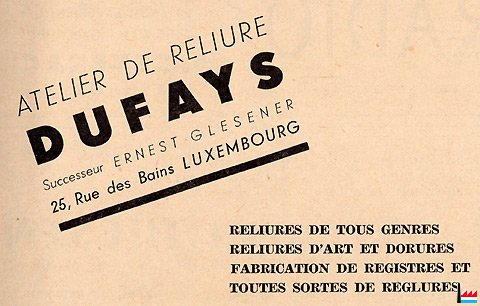 | 1947 | Ateliers de reliure Dufays, Ernest Glesener - Stors succ., 7 rue des Bains, Luxembourg |