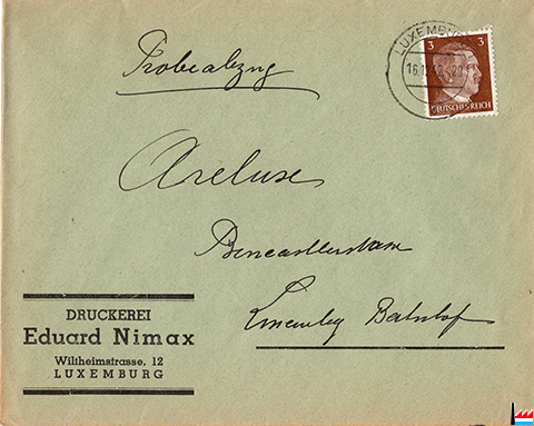 Druckerei Eduard Nimax, Wiltheimstrasse 12, Luxemburg - Arelux, Bernkastelerstraße, Luxemburg-Bahnhof (Enveloppe - Briefumschlag - 16.12.1942; Collection: industrie.lu)