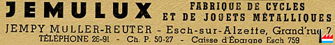| 1947/48 | JEMULUX Fabrique de cycles et de jouets métalliques Jempy Muller - Reuter Grand'Rue 7 Esch/Alzette |
