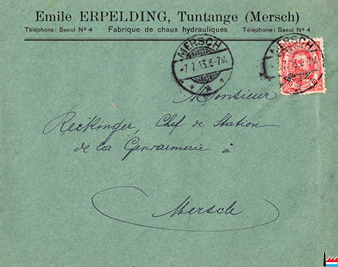 Fabrique de chaux hydrauliques Emile Erpelding, Tuntange Tél: Saeul N°4 - Lettre 7.7.1913 (Collection: industrie.lu)
