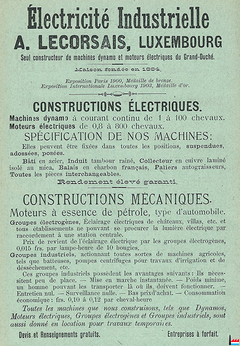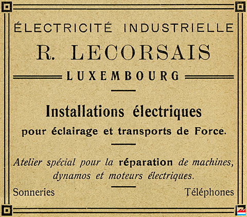 | 1910 | Electricité industrielle, A. Lecorsais, Luxembourg Exploitant : Ad. Lecorsais. Luxembourg |