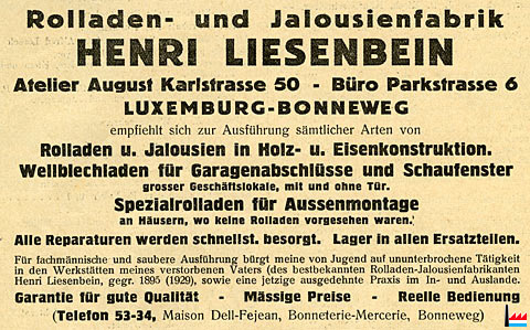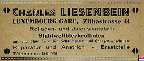| <=1935 | Henri Liesenbein, fabrique de jaloisies et de volets, 6 rue du Parc, Bonnevoie Charles Liesenbein , fabrique de jaloisies et de volants roulants, 44 rue Ste Zithe, Luxemburg-Gare |
