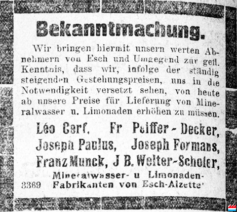 Paulus-Barnich, Esch/Alzette, 14 Schulstrasse (Limonaden-Fabrik, Mineralwasser, Selterswasser) (1910) |