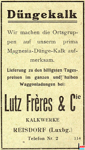 | 4.1928 | Lutz Frères et Co Gips- und Kalkwerk in Reisdorf Täglich frisch gebrannter Kalk als Stückkalk, Sackkalk, Düngekalk (LW: 6.4.1928) |