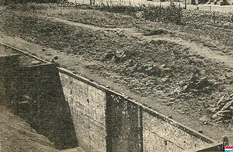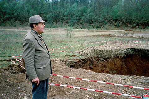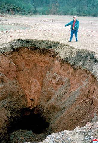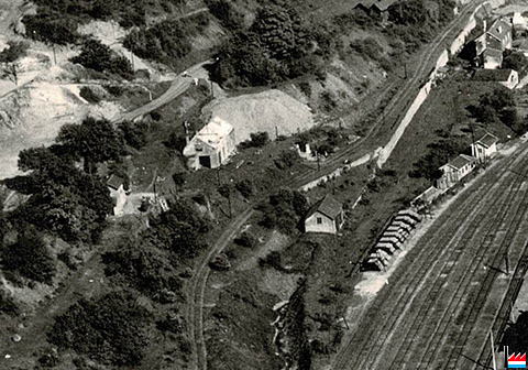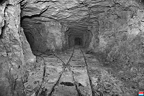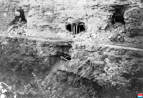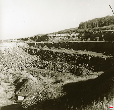 Galerie, genau hannert dem Zementswierk vun Remeleng. Déi Galerie soll schon 90 Joër äusser Betrieb gewiecht sin an komesch ass et gêtt op der ganzer Streck (4 km), keng èng Ofstéip (Foto: 1990 Remo Raffaelli)