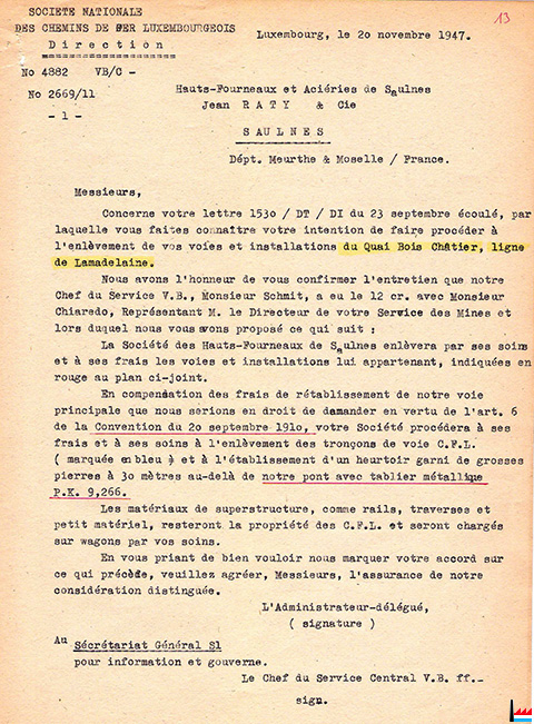 Quai Bois Châtier, lettre du 20.11.1947 (Collection: Marcel Schlim)