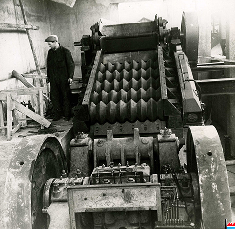 Installation du Bois du Châ de la S.A. des H.F. de la Chiers - Longwy: Alimentateur à palettes - grilles à rouleaux - concasseur ARBED Dommeldange CMR85 en cours de montage (Photo: ARBED Dommeldange; collection: industrie.lu)