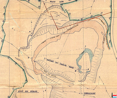Exploitation à ciel-ouvert Eweschbour : embouchure, galerie en couche grise - piste vers gradin - dépôt des déblais - dépôt à ordures - Plan 25.8.1956 - Exploitant: Neu & Stauder (Scan: Jeannot Lunkes)