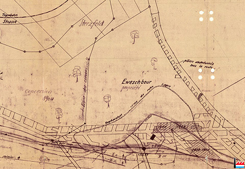 Eweschbour : Konzession Steinfort , Konzession Besing (Halanzy), travers-bancs, couche grise, couche jaune, couche rouge, ligne du concessible - Konzessionsgrenze, essai de traverser, Mittelsprung, séries de failles formant la faille médiane, graues Lager abgebaut, Trambahn TICE, concession 1904, Sterzfeld, puits grise - rouge, Tagebaustoss des roten Lagers 1.4.1939, embouchure / Stollenmundloch, piliers abandonnés sous la route, ancienne galerie à la couche grise - Tiefer Stollen + 316,65, Linster, Reuter - Plan der Grube Eweschbour 1940 (Scan: Jeannot Lunkes)