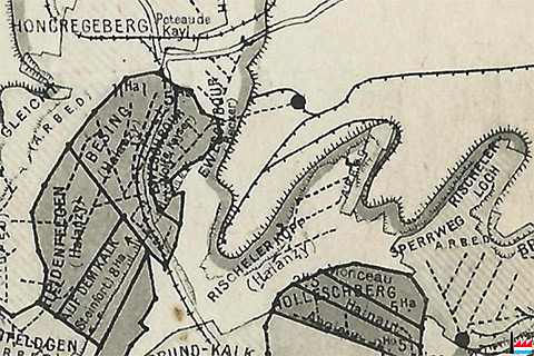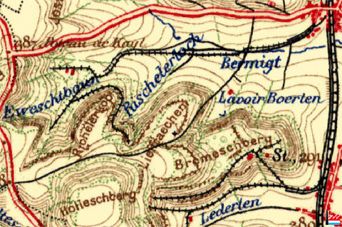 Mine Eweschbour - Mine Rischlerkopp, Kayl - 1927 © Origine Administration du Cadastre et de la Topographie Luxembourg (ACT) - Extrait de la carte topographique à l'échelle 1: 50.000 édition 1927 - Autorisation de publication du 20.10.2010.»