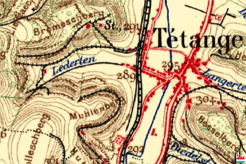 Bromeschberg - Lederten - Mühlenberg, Tétange - 1927 © Origine Administration du Cadastre et de la Topographie Luxembourg (ACT) - Extrait de la carte topographique à l'échelle 1: 50.000 édition 1927 - Autorisation de publication du 20.10.2010.»