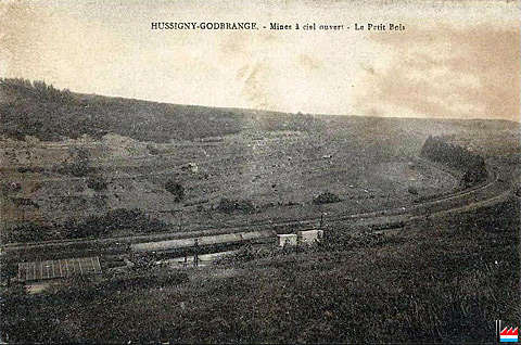 Le Petit Bois était une exploitation à ciel ouvert, dont une partie était située sur le territoire français et l'autre sur le territoire lux... la partie fr. s'étendait depuis la douane fr. jusque vers "Bache Jhang"; la suite, jusqu'à la maison Schneider, était située en territoire lux et était une annexe de l'exploitation "Halberg"... Petit Bois fr. a été exploité par la SLI, ensuite par Raty, Petit Bois lux par "Rud. Boecking" (groupe Stumm), plus tard par "Pont-à-Mousson"... sur la carte, on aperçoit à gauche la toiture recouvrant le quai-estacade de la mine de Hussigny. (Luciano Pagliarini)