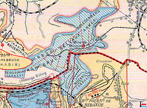 | 1910 - 20 | Nombreuses galeries nouvelles au lieu-dit «Bei de Stèkaulen» ; Exploitants: Aug. METZ - LE GALLAIS ; Minerai envoyé au premier plan incliné de BELVAUX (ARBED). |