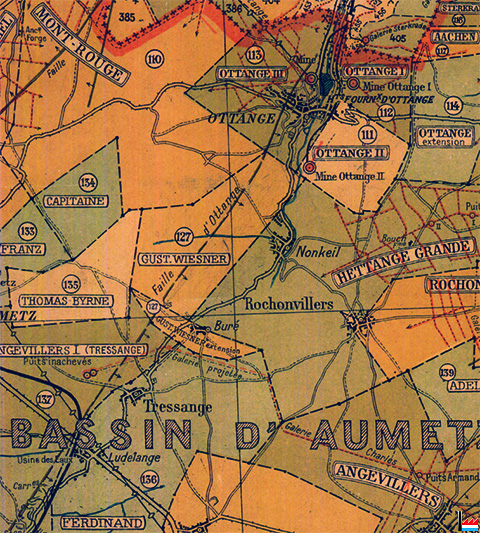entre les concessions / mines: Mont-Rouge (110) - Ottange III (113) - Ottange II (111) - Hettange-Grande (126) - Gust. Wiesner extension (127) - Thomas Byrne (135) (Carte Collection: industrie.lu)