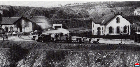 Gebaier vum Carreau de la Mine de Dudelange vun 1904 aus dem Buch Dudelange - Passé et présent d'une ville industrielle vum Jean-Pierre Conrardy: lënks den Lokschapp mat Schmëtt, riets d'Bureauën