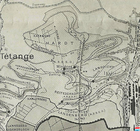 Mine Herenterberg - Mine Hesselberg,Tétange - Minières de Dudelange (Aus: Daten aus der Luxemburgischen Eisenindustrie, n° IX. - Zusammengestellt von Camille Aschman, A-Z, 08.1935 - Collection famille Aschman-Bodson)