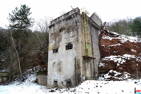 Sand-Silo mit Sandtrockner für die Grubenloks, links Grubeneingänge des Galgenberges (Photos: 30.12.2014 jmo)