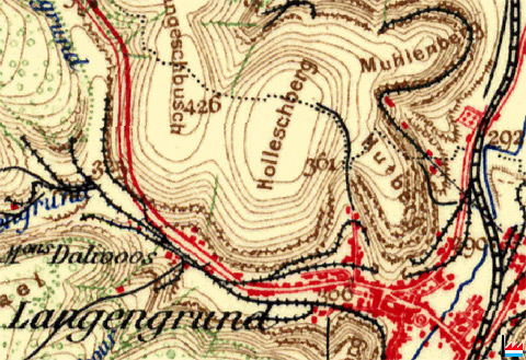Hutberg, Laangegronn, Rumelange - 1954 © Origine Administration du Cadastre et de la Topographie Luxembourg (ACT) - Extrait de la carte topographique à l'échelle 1: 25.000 édition 1954 - Autorisation de publication du 20.10.2010.»
