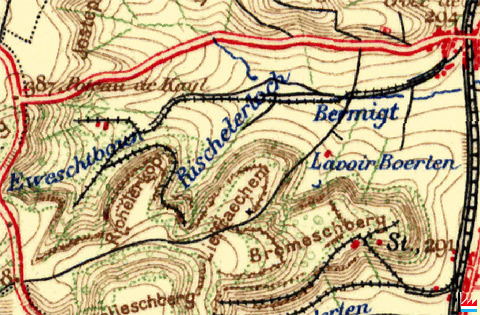 Mine Eweschbour - Mine Rischlerkopp, Kayl - 1927 © Origine Administration du Cadastre et de la Topographie Luxembourg (ACT) - Extrait de la carte topographique à l'échelle 1: 50.000 édition 1927 - Autorisation de publication du 20.10.2010.»