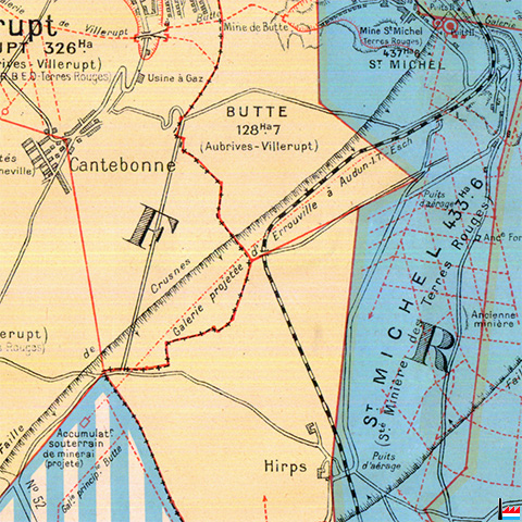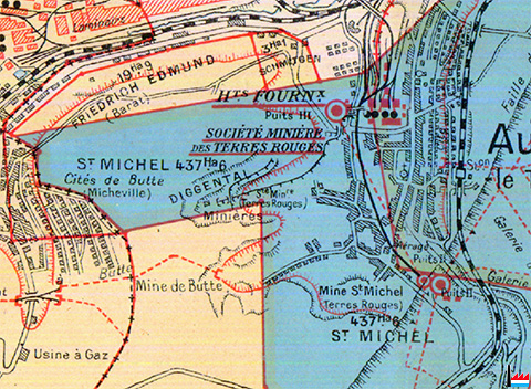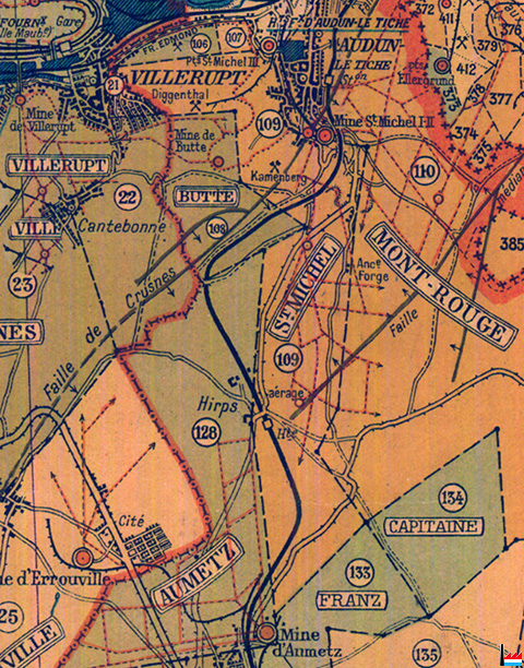 entre les concessions / mines: Friedrich Edmund (106) - Schmitgen (107) - Mont-Rouge (110) - Franz (133) - Aumetz (128) - Butte (108) - Cantebonne (21)