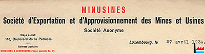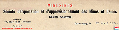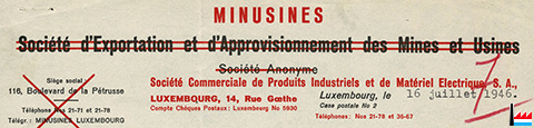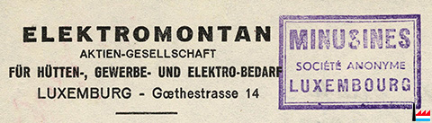 | 1944/45 | ![]() "ELEKTROMONTAN A.G. - für Hütten-, Gewerbe und Elektro-Bedarf" wird wieder MINUSINES (Collection: industrie.lu) Goethestraße 14, Luxemburg |