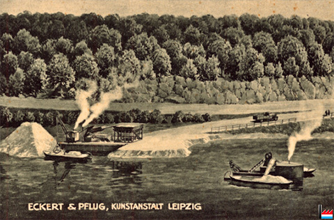 Baggereibetrieb in Erpeldingen - Dragage à Erpeldange (Extrait de la carte postale: Eckert & Pflug, Kunstanstalt Leipzig, Imprimerie Geisbusch, Clervaux; collection: Roger Medernach)