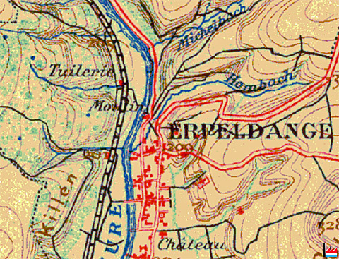 Tuilerie - Moulin - Château, Erpeldange © Origine Administration du Cadastre et de la Topographie Luxembourg (ACT) - Extrait de la carte topographique à l'échelle 1: 50.000 édition 1927 - Autorisation de publication du 20.10.2010.»