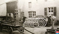 | Heimisches Holz wurde 2 Jahre im Holzlager getrocknet (an der Drëschent, mat Rellen tëschend den Dill) Dicke: 26 mm auf 22 mm gehobelt Höhe je nach Verwendungszweck: meistens 40 mm, aber auch 34 mm und 50 mm Die Sprossen wurden dann auf der Vierseitenhobelmaschine in einem Arbeitsgang gehobelt Herstellung der Zapfen auf der Zapfenmaschine (Zëppmaschine, tenoneuse, gezeppt) Prüfung der Sprossen |