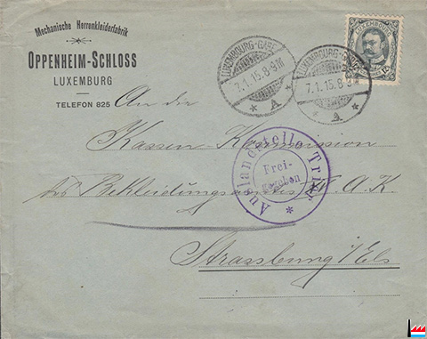 | 1.1915 | ![]() Mechanische Herrenkleiderfabrik Oppenheim-Schloss, Luxemburg. tél: 825 (Collection: Serge Kugener) Auslandstelle Trier - Freigegeben |