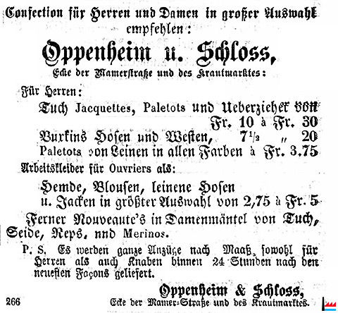 | <=1873 | Oppenheim & Schloss, Regierungsstr. 2 Oppenheim Hermann, Kaufm., Regierungsstrasse 2 (In: Luxemburger Wegweiser, Schintgen B., pens. Lehrer, Luxemburg - Druck von Fr. Beffort, Luxemburg, 1873) |