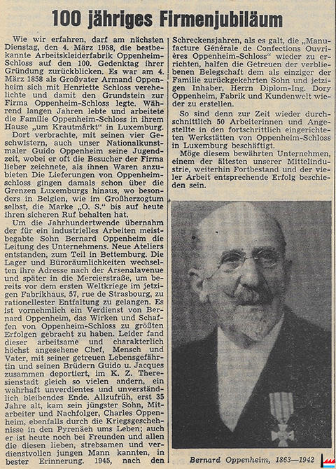 Oppenheim-Schloss: 100 jähriges Firmenjubiläum (LW 27.2.1958 p. 5; Scan: Fernand Toussaint)