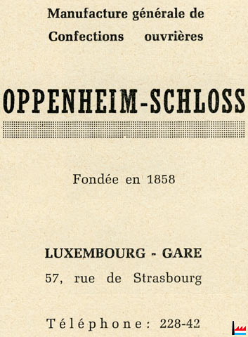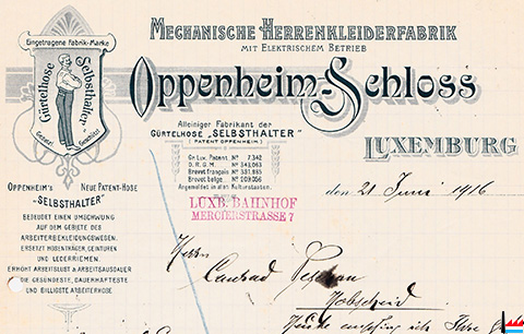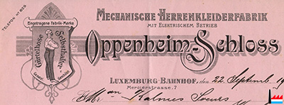 | Oppenheim-Schloss, Luxemburg. Herrenkleiderfabrik. Inhaber : Bernard Oppenheim, Luxemburg. (Inscription au registre aux firmes N° 759 - Du 30 juin 1910) |