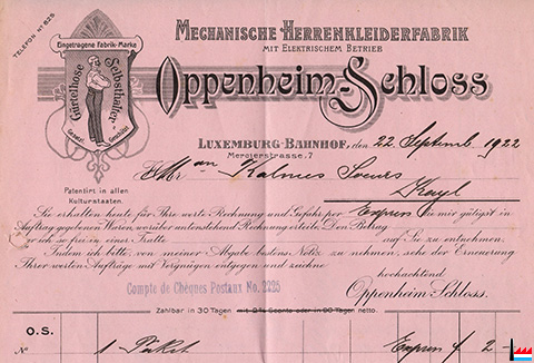 Mechanische Herrenkleiderfabrik mit elektrischem Betrieb Oppenheim - Schlosss, Mercierstrasse 7, Luxemburg-Bahnhof (Rechnung vom 22.9.1922;