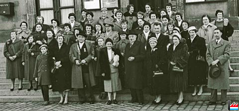 Ein Teil der Belegschaft mit der Familie Oppenheim: Herr und Frau Dory Oppenheim, Charles-Louis Oppenheim, Bernard-Guido Oppenheim im Jahre 1958