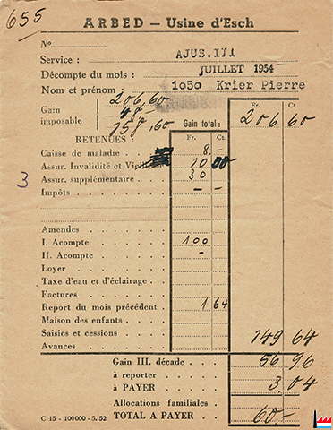 Paitut - Paiziedel vun der Schëfflenger Schmelz - Arbed Esch Schifflange - Lohntüte - Krier Pierre - 7.1954 (Collection: industrie.lu)
