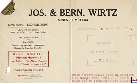 ![]() Jos. & Bern. Wirtz, Mines et Métaux - facture du 2.12.1919 (Collection: industrie.lu) Siège social: Luxembourg: Bureaux: Bruxelles, 12 place des Martyrs, Belgique Département: Rails Seuls représentants pour la Belgique de la maison Paul Wurth & Cie, Luxembourg |
