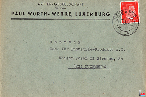Briefumschlag der A.G. der Vorm. Paul Würth - Werke, Luxemburg an Coprodi - Gesellschaft für Industrie-Produkte A.G., Kaiser Josef II Strasse 8a, Luxemburg - während der deutschen Besatzung - 10.3.1944 (Collection: industrie.lu)