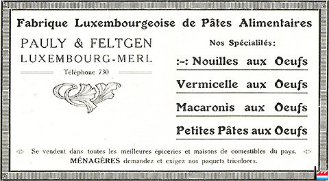 | 1922 | Fabrique de pâtes alimentaires à Luxembourg, Guillaume Pauly et Charles Feltgen, tous deux industriels à Luxembourg, associés en nom collectif. Capital: 100.000 fr. Société en nom collectif constituée par acte sous seing privé dûment publié. Elle finira le 30 juin 1950. (Registre aux firmes N° 594 - Du 1er février 1922. |